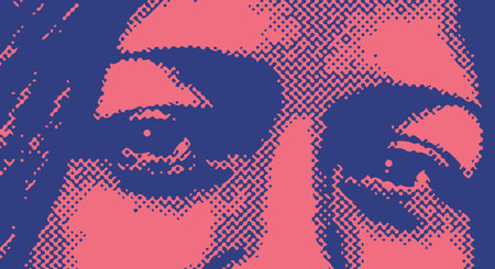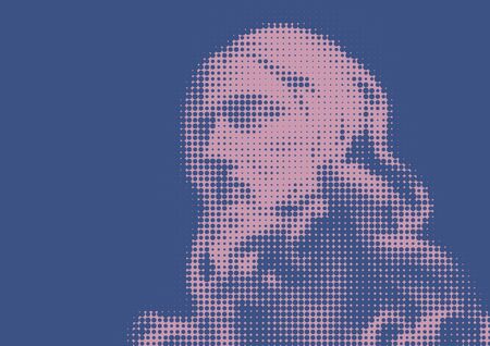 Close-up of a face with a focus on two blue eyes, created in a dot-matrix graphic style