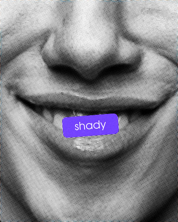 Composite image features pursed lips, purple label symbolizing suspicion. Comic-style halftone effect. Concept of secretive emotion, guarded expression, subtle communication.