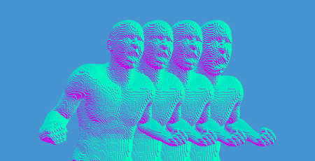 Four strong men screaming. Voxel art. 3D vector illustration.