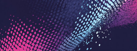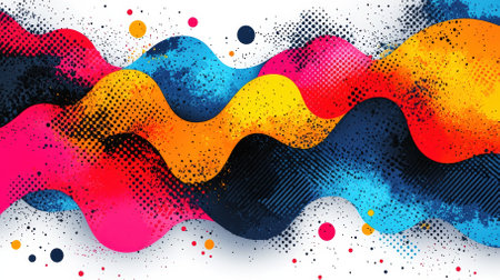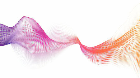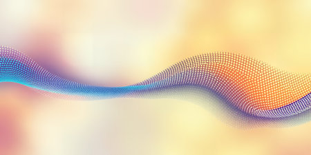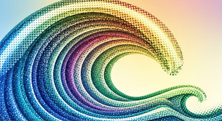 An abstract illustration presents a flowing wave composed of multicolored dots. The dynamic composition uses a dark background to highlight the gradient hues. The visual texture implies a digital or vector style. Suitable for graphic design projects and various commercial applications.