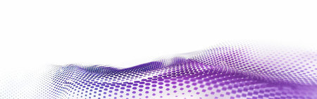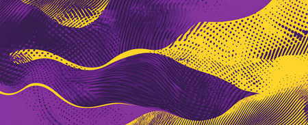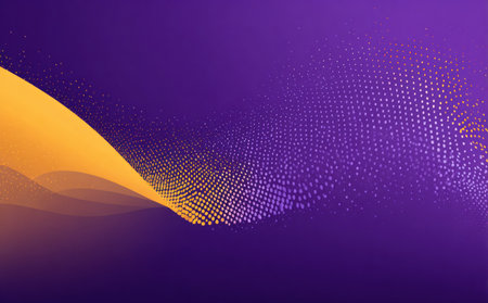 An abstract digital illustration showcases a flowing wave element in vibrant gold against a deep purple backdrop. The composition features a textured appearance created through numerous small dots, with soft gradients adding depth and dimension. This design may be suitable for various commercial uses, including digital backgrounds and design elements.