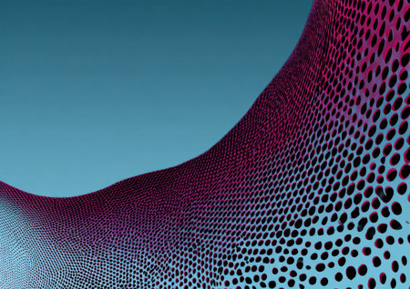 A wavy, pink-and-black perforated surface against a gradient blue background
