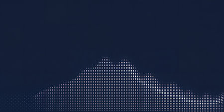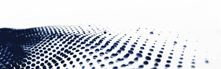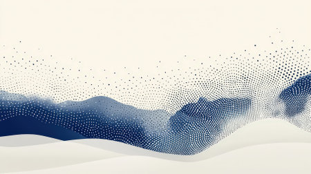 A visually striking arrangement of bold halftone dots forms undulating wave patterns across a white backdrop. The deep navy blue tones create a bold contrast.