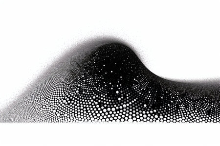 An abstract illustration presents a wave-like pattern constructed from numerous dots in varying shades of grey. The design showcases a textured appearance, offering a sense of depth and movement against the bright white backdrop. This image could be applied in diverse editorial and commercial projects.