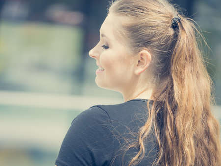 Happy teen woman enjoying her leisure time. Female having long brown hair posing with big smile