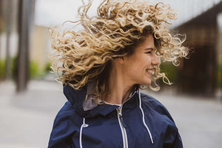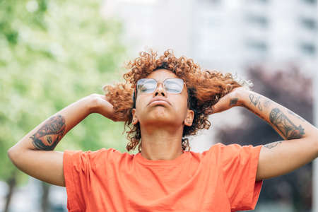 Portrait of a latin woman with curly hair looking straight distracted outdoors