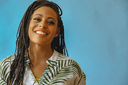closeup portrait of smiling young beautiful african american woman braid hair posing at studio looking at camera