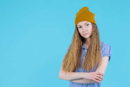 Smiling, positive teenage girl playing with her hair on a blue background. The girl is posing