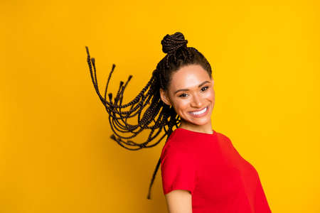 Profile portrait of charming carefree dark skin girl hair flying toothy smile isolated on yellow color background