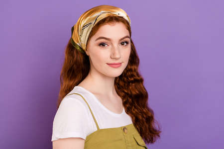 Photo of calm peaceful young woman wear bandana ginger hair isolated on purple violet color background