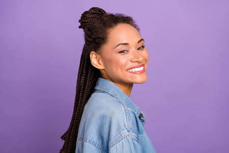Profile side view portrait of attractive cheerful brunette girl posing good mood isolated over shine purple violet red color background