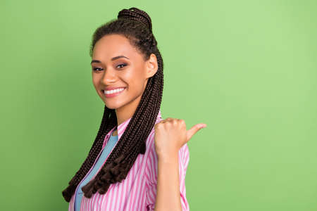 Photo of cute shiny dark skin woman dressed striped shirt pointing thumb up back empty space smiling isolated green color background