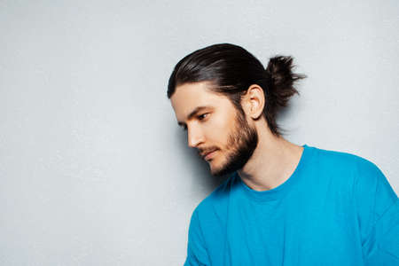 Close up profile portrait of young man with long hair and beard by white background