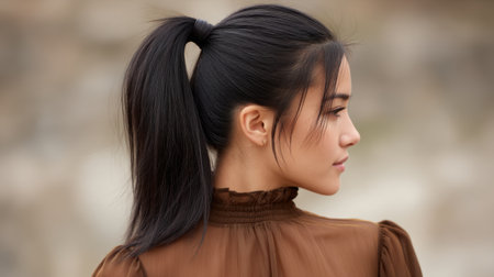A graceful woman with long, black hair styled in a ponytail is captured in profile against a softly blurred background. The image highlights elegance and fashion.