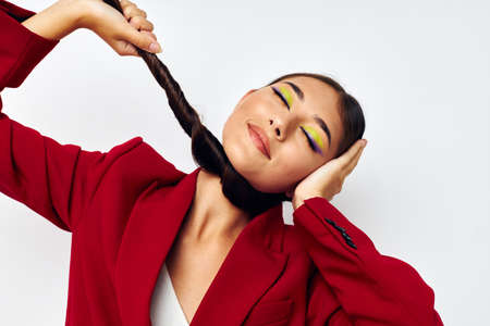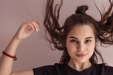 portrait pretty woman holding on to the pigtail light background unaltered