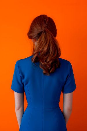 Elegant redhead woman in a blue dress against a vibrant orange backdrop