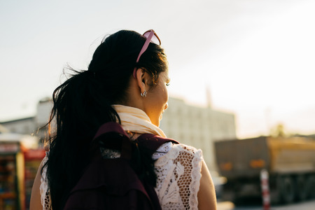 Girl traveler with a backpack walking around the city at sunset