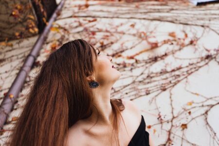 luxurious long-haired rich woman walking in the garden, looking up
