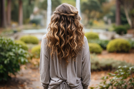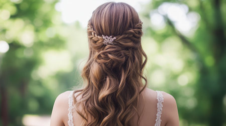 Capture the elegance of a woman's hairstyle from the back, adorned with a delicate accessory. Set in a serene outdoor location surrounded by lush greenery.