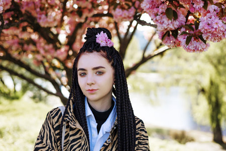 beautiful young teen girl in spring blooming cherry blossoms garden