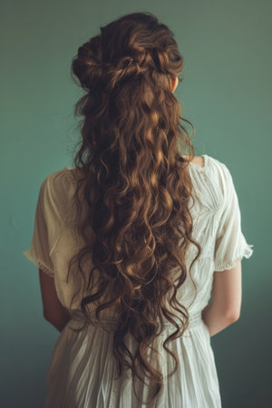 Elegant half-up, half-down hairstyle with loose waves and a delicate braid, perfect for a romantic and youthful appearance.