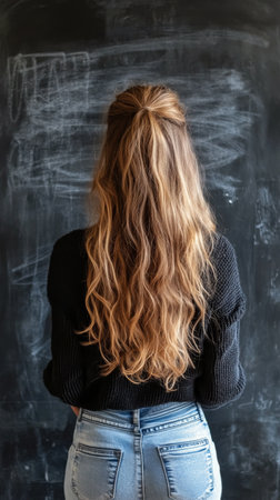 A young woman with soft features and light hair gazes thoughtfully at the viewer, standing against a dark chalkboard filled with writing. Her casual sweater adds a relaxed vibe to the moment.