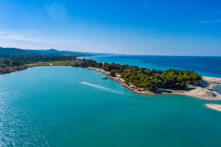 Aerial view of Vourvourou beach, small peninsula in turquoise water of Aegean sea. Waves beating cliff rocky coastline. Halkidiki, Greece.