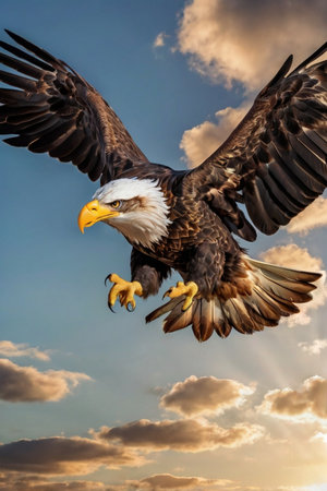 Bald eagle soaring with outstretched wings, preparing to dive towards its prey in a majestic display of power and grace