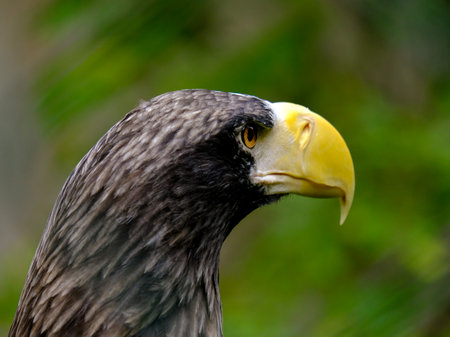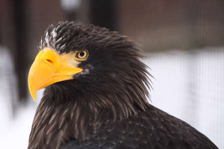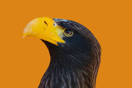 Haliaeetus pelagicus, side close-up portrait of Stellers sea eagle head with nice yellow beak. High quality photo