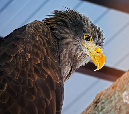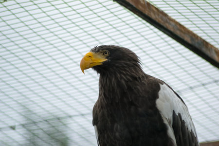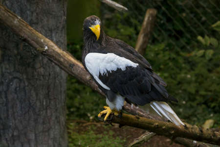Majestic Steller sea eagle perched on a wooden branch in Belgrade Zoo, showing its powerful yellow beak and dark plumage