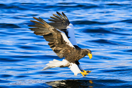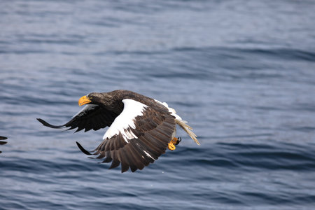 Steller´s sea eagle in flight hunting fish from sea,Hokkaido, Japan, Haliaeetus albicilla, majestic sea eagle with big claws aiming to catch fish from water surface, wildlife scene,birding in Asia