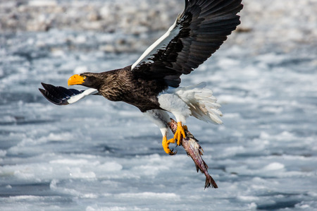 Steller's sea eagle in flight with prey on a background of the frozen sea. Japan. Hakkaydo. Shiretoko Peninsula. Shiretoko National Park. An excellent illustration.