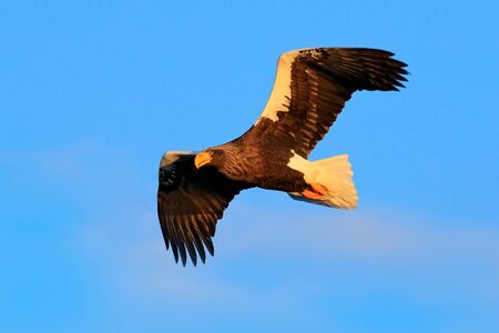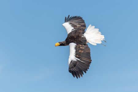Steller's sea eagle, Haliaeetus pelagicus, flying bird of prey, with blue sky in background, Hokkaido, Japan. Eagle fly, open wings. Eagle flight durring winter. Wildlife scene. Bird on the blue sky.