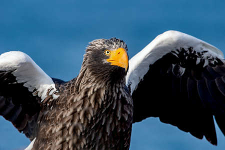 Adult Steller's sea eagle spread its wings. Front view, Close up portrait of Adult Steller's sea eagle. Scientific name: Haliaeetus pelagicus. . blue background.