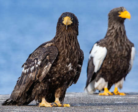 Steller's sea eagles. blue sky and ocean background. Scientific name: Haliaeetus pelagicus. natural habitat. winter season.