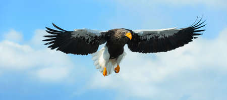 Steller's sea eagle in flight. blue sky background. Scientific name: Haliaeetus pelagicus. natural habitat. winter season.