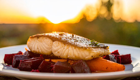 Pan-seared white fish fillet with roasted beets and carrots served outdoors at sunset.