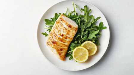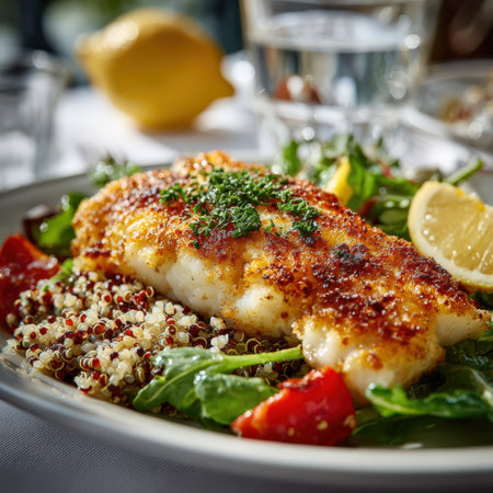 Delicious grilled fish fillet on a plate with quinoa salad, fresh greens, and lemon slices, creating an inviting and colorful dining experience