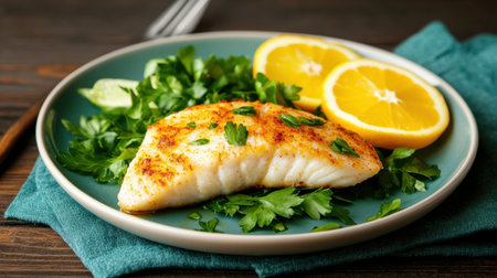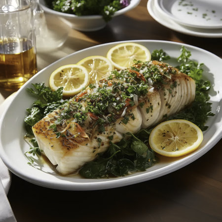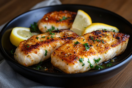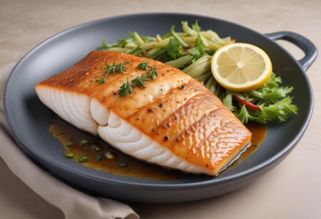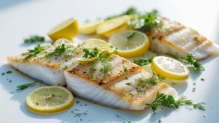 Enjoy a beautifully plated pan-seared fish fillet accented with lemon and fresh herbs, presenting an appetizing and flavorful meal perfect for any dinner gathering.