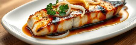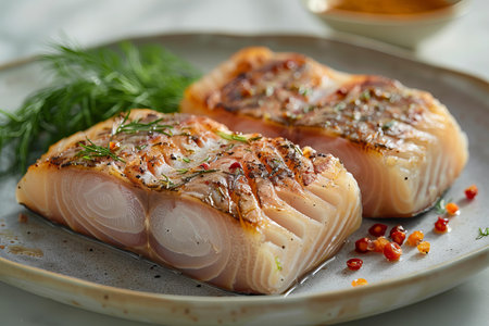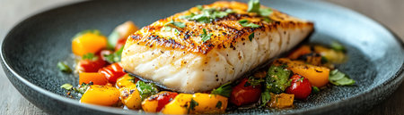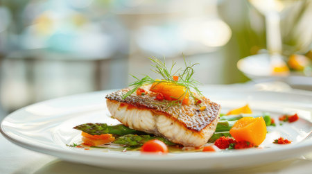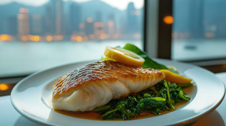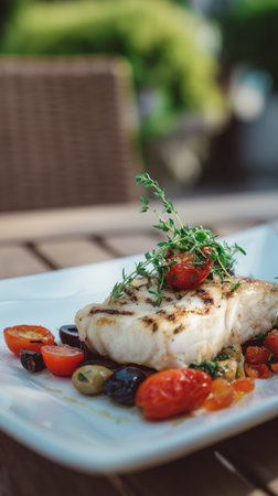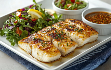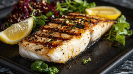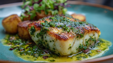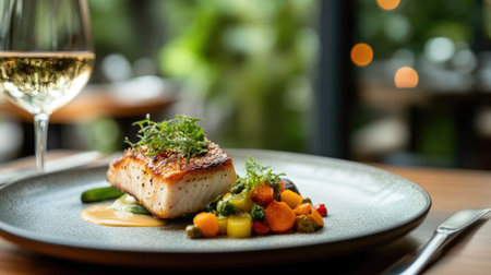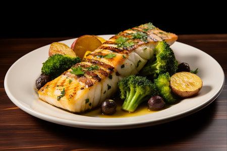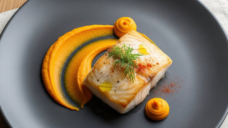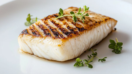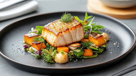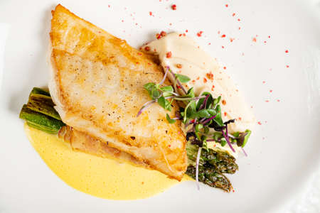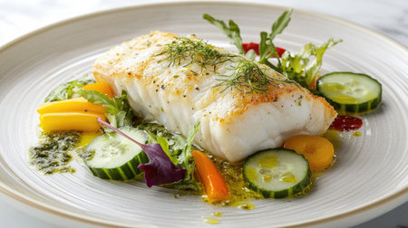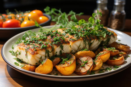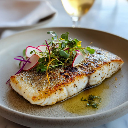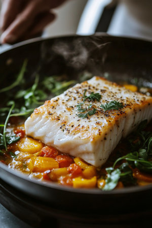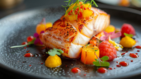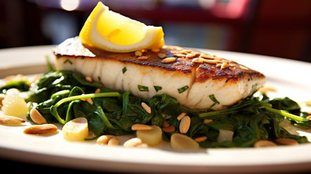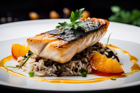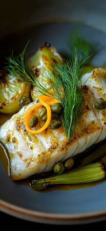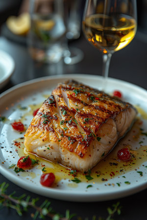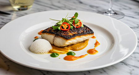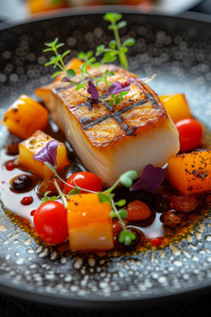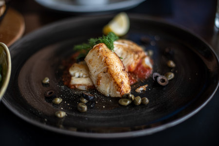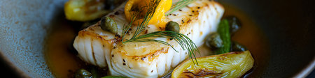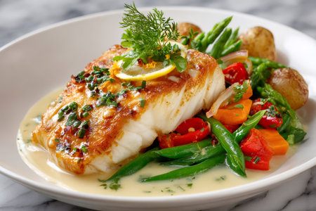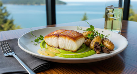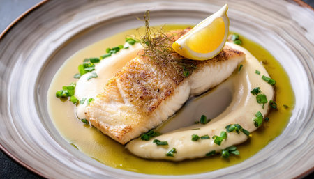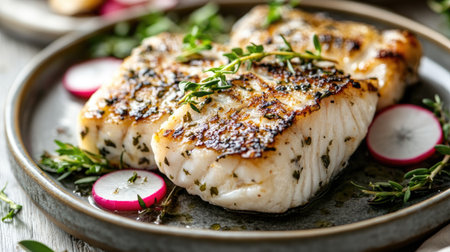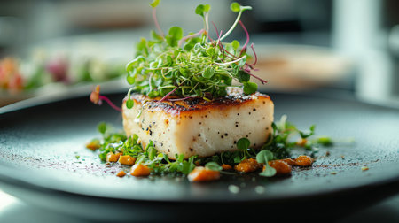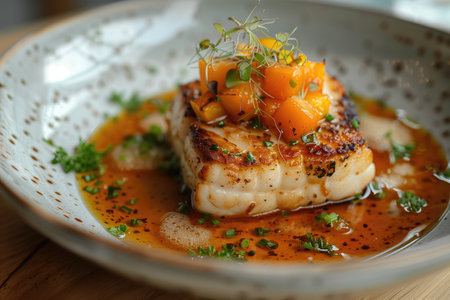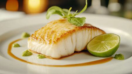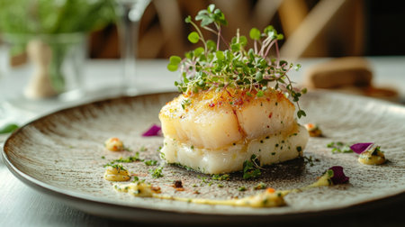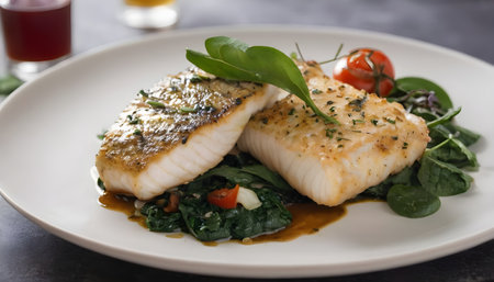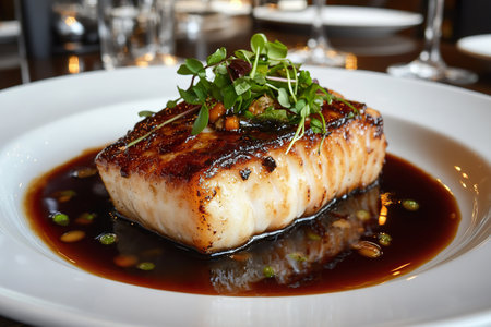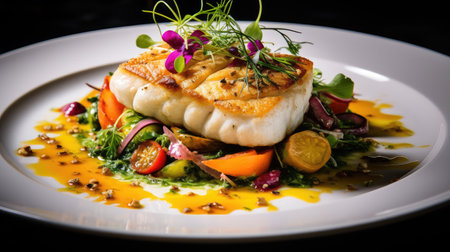 Closeup of a delectable panseared cod dish, garnished and ready to be served at a highend restaurant