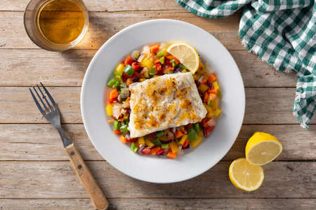 Grilled cod with vegetables on blue wooden table
