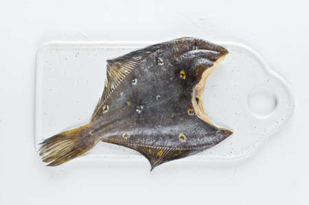 Raw plaice. White background, side view