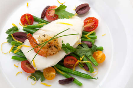 Delicious pan seared fish fillet served with asparagus, potatoes, peppers, and green beans