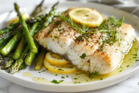 Delicately cooked cod fillet on a white plate, topped with a lemon butter sauce and served with a side of steamed asparagus and crispy potatoes.