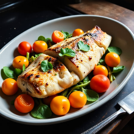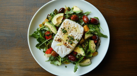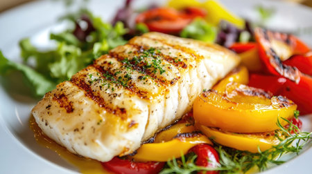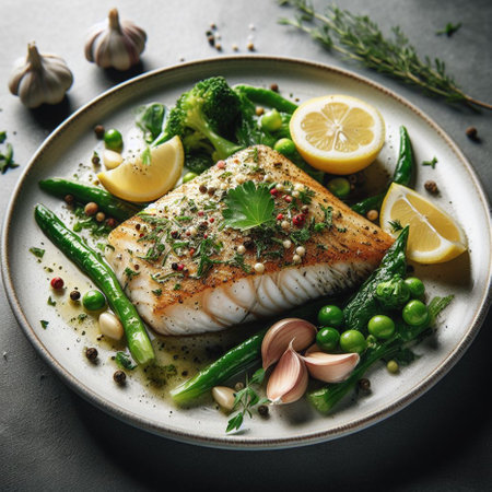 AI Generated. Grilled Fish Plated with Fresh Vegetables and Herbs