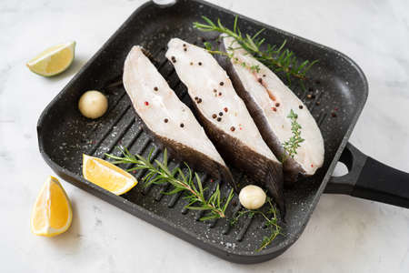 Raw halibut fish steaks with herbs and lemon prepared for cooking in grill pan. Healthy omega 3 unsaturated fats good for brain and mental clarity