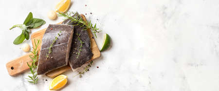 Raw fresh white fish steak with rosemary and seasoning on wooden table for tasty diet. Top view. Food cooking ackground with copy space.