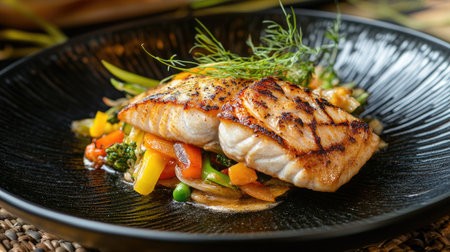 A beautifully plated grilled white fish fillet rests on a vibrant mix of sauteed vegetables and garnished with fresh herbs, showing an elegant culinary presentation.