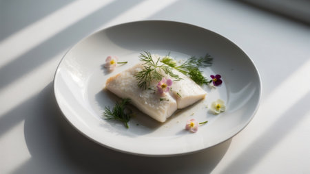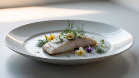 AI Generated. Seared White Fish with Dill and Edible Flowers
