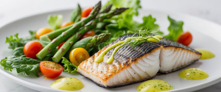 AI Generated. Grilled fish served with fresh vegetables and a tangy sauce on a white plate